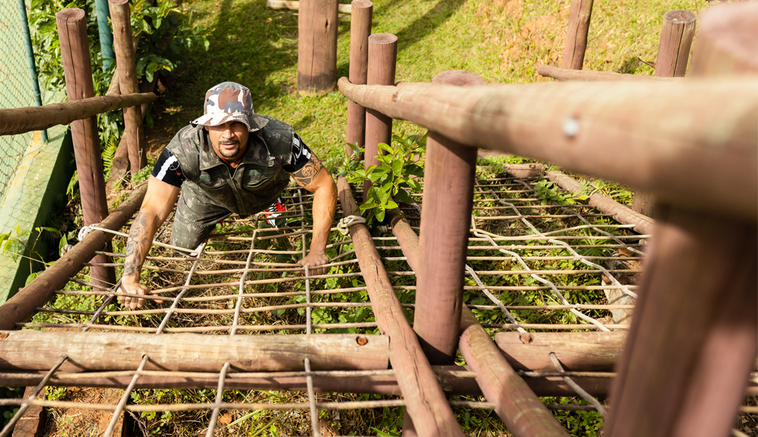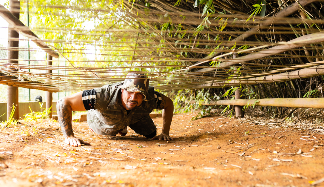 Um circuito de 16 obstáculos inspirados em equipamentos militares, distribuídos em aproximadamente 120 metros de extensão.