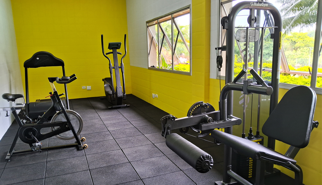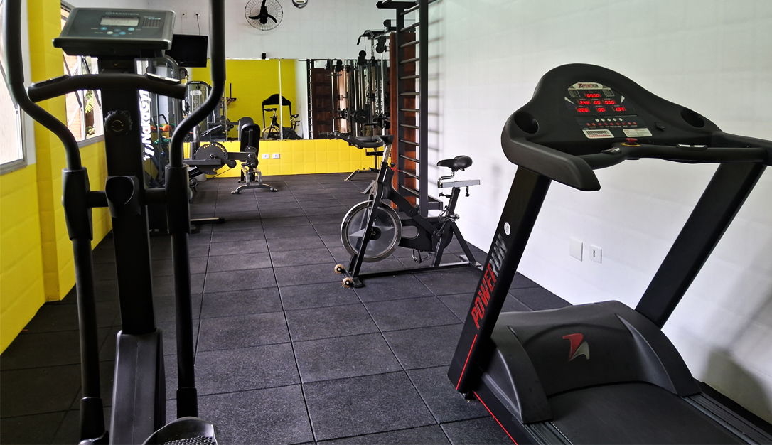 Espaço fitness equipado com estação multifuncional de musculação, cadeira flexora/extensora, esteira com inclinação, elíptico, bike spinning, entre outros.